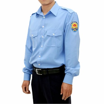 - Áo nam: Áo kiểu cổ đứng. Thân trước ngực may hai túi ốp ngoài, bị túi may đố, nắp túi vát nhọn. Nẹp bong một hàng sáu chiếc cúc nhựa cùng màu vải, may bật vai đeo cấp hiệu. Thân sau cầu vai rời xếp hai ly. Tay dài có măng séc cài cúc, may thép tay, cửa tay mỗi bên xếp hai ly lật về phía thép tay, trên cánh tay trái may dán ký hiệu bảo vệ cơ quan hoặc doanh nghiệp. Gấu áo bằng.