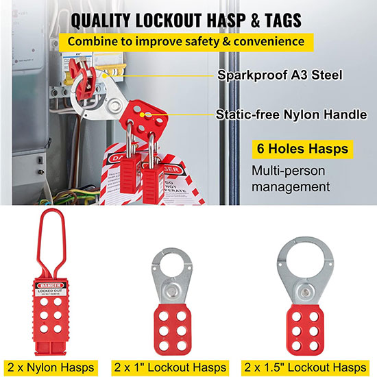 | Móc khóa an toàn nhiều người (Hasp) | 6 chiếc (4 hàm thép + 2 hàm nylon) | Cho phép 6 người cùng khóa một điểm – lý tưởng cho làm việc nhóm |