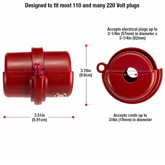 3. Khả năng tương thích đa dạng với các loại phích cắm Master Lock 487 được thiết kế để phù hợp với hầu hết các loại phích cắm điện áp 110V và 220V, bao gồm cả phích cắm 2 chấu và 3 chấu. Sản phẩm hỗ trợ phích cắm có kích thước: - Đường kính phích cắm tối đa: 2-1/4 inch (57 mm) - Chiều dài phích cắm tối đa: 3-1/4 inch (82 mm) - Đường kính dây cáp hỗ trợ: lên đến 3/4 inch (19 mm) Thiết kế này cho phép khóa tương thích với nhiều loại thiết bị điện trong các ngành công nghiệp khác nhau như máy điều hòa, máy giặt công nghiệp, máy móc sản xuất, đảm bảo khả năng bảo vệ an toàn trong mọi tình huống.