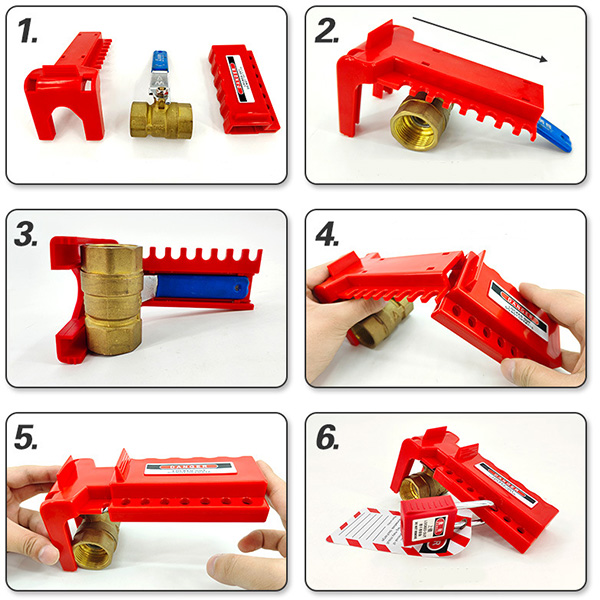 🛠 Hướng Dẫn Sử Dụng Và Lắp Đặt Chi Tiết - Kiểm Tra Vị Trí Van: Xác nhận van ở trạng thái "TẮT" (OFF) trước khi tiến hành khóa, đảm bảo an toàn ban đầu. - Lắp Chèn Tháo Rời: Điều chỉnh chèn tháo rời để phù hợp với kích thước và kiểu dáng tay gạt van, đảm bảo tiếp xúc sát. - Đặt Thiết Bị Với Bảng Phụ: Bao quanh tay gạt van, sử dụng bảng phụ phía sau cho van đôi nếu cần, để tăng cường cố định. - Khóa An Toàn: Chèn ổ khóa an toàn hoặc kết hợp với khóa cáp vào lỗ 8mm, đảm bảo không thể tháo rời mà không có chìa. - Gắn Thẻ Cảnh Báo: Sử dụng thẻ tagout để ghi rõ thông tin người thực hiện khóa, lý do, và thời gian, tuân thủ quy trình LOTO.