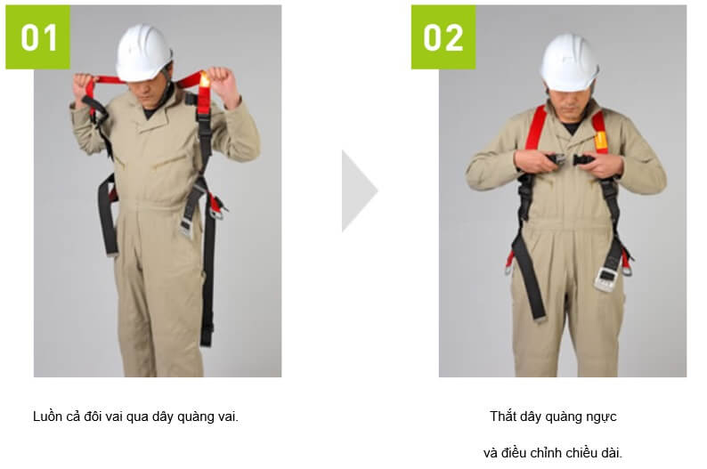 Vì loại đai toàn thân có các biến thể khác nhau, hãy chọn loại phù hợp với tính chất công việc. (Xem “Cấu tạo và các loại đai toàn thân” ở trên)
