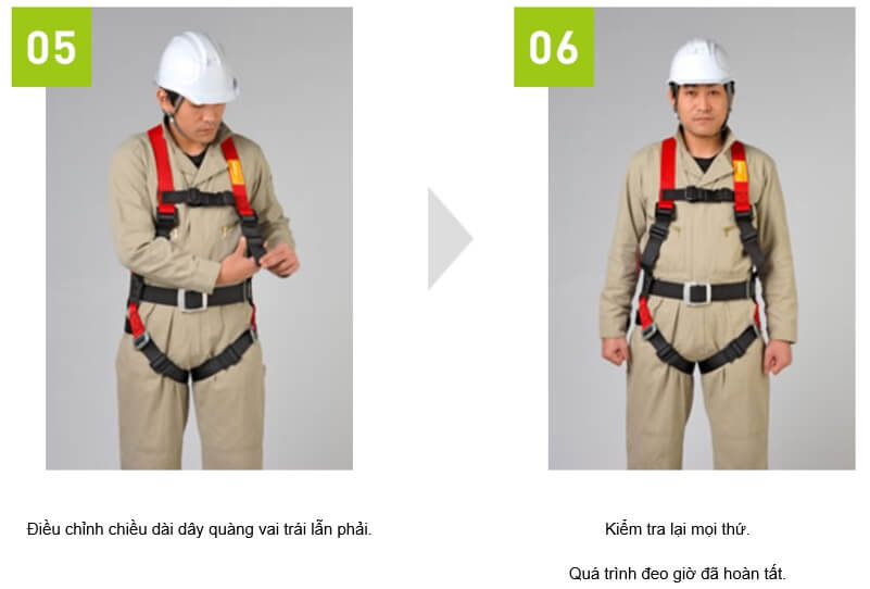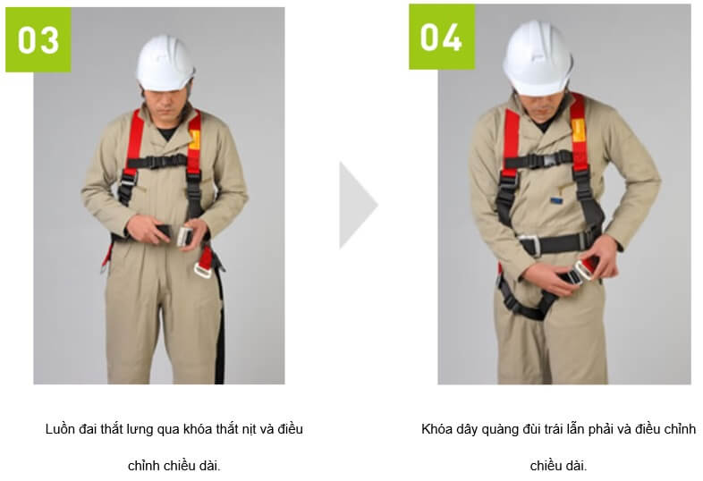 - Đối với loại đai toàn thân, hãy đeo thiết bị vừa khít và không bị lỏng để đai không bị rơi ra và mất khả năng duy trì tư thế an toàn khi chặn đứng cú rơi. Ngoài ra, không được loại bỏ bất kỳ bộ phận an toàn cần thiết nào chẳng hạn như dây choàng ngực.