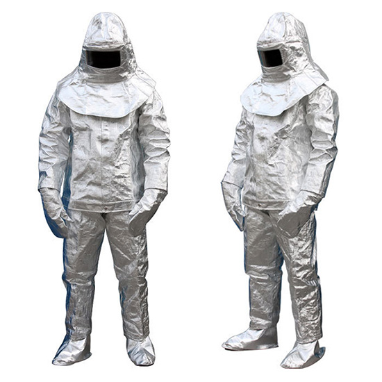 - Quần + áo chống cháy chịu nhiệt: Làm bằng sợi tổng hợp tráng nhôm chống cháy, phản xạ lại nguồn nhiệt, ngăn bức xạ nhiệt, chống ăn mòn, chống hóa chất, chống dầu, dễ lau chùi, không thấm nước. Chịu được nhiệt độ lên tới 500độ C. Không có túi đựng bình dưỡng khí sau lưng. Sử dụng cho lính cứu hỏa, dầu khí, xi măng, sắt, thép, hóa chất, điện…