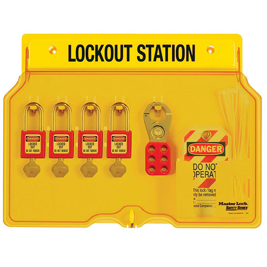 Trạm khóa treo tường với 4 khóa móc và phụ kiện an toàn Master Lock 1482B P410